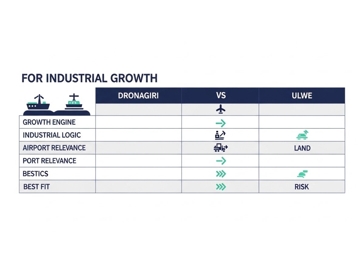 Dronagiri tends to make more sense when the question is: Will this location become more relevant to freight, warehousing, export-linked movement, or industrial support activity? Ulwe tends to make more sense when the question is: Will this location become more visible, more connected, more desirable, and more valuable as airport-led urban development expands? Those are not interchangeable questions. They lead to different buy decisions. The first is industrial land logic. The second is land appreciation versus industrial practicality.