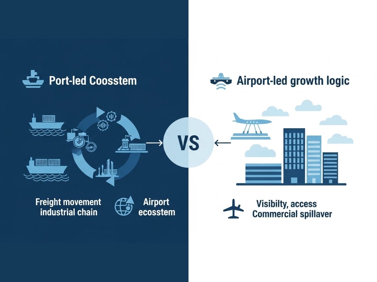 | Core growth engine | Port ecosystem, logistics chain, freight relevance | Airport adjacency, urban growth, commercial spillover | These are not the same thesis |