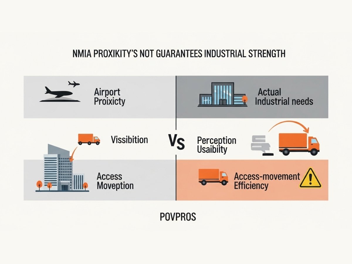 That is the central mistake in many Ulwe industrial-growth pitches. The airport story is real. The over-translation is the problem. Buyers start assuming that “near airport” automatically means “best industrial bet.” It does not. Cargo-support ecosystems need land-use compatibility, access efficiency, truck movement practicality, storage logic, and real industrial absorption. Without those, airport proximity becomes a pricing story faster than it becomes a strong industrial-use story.