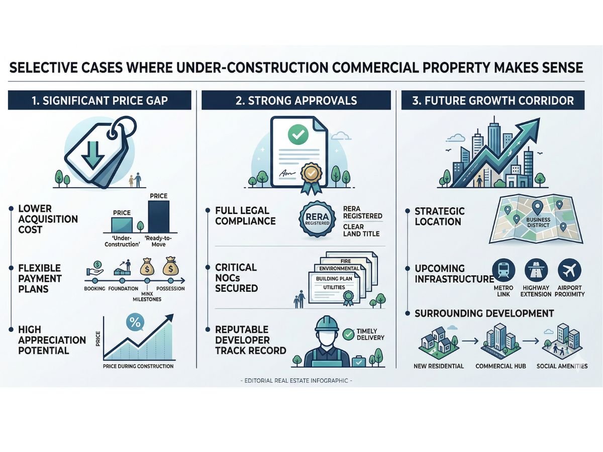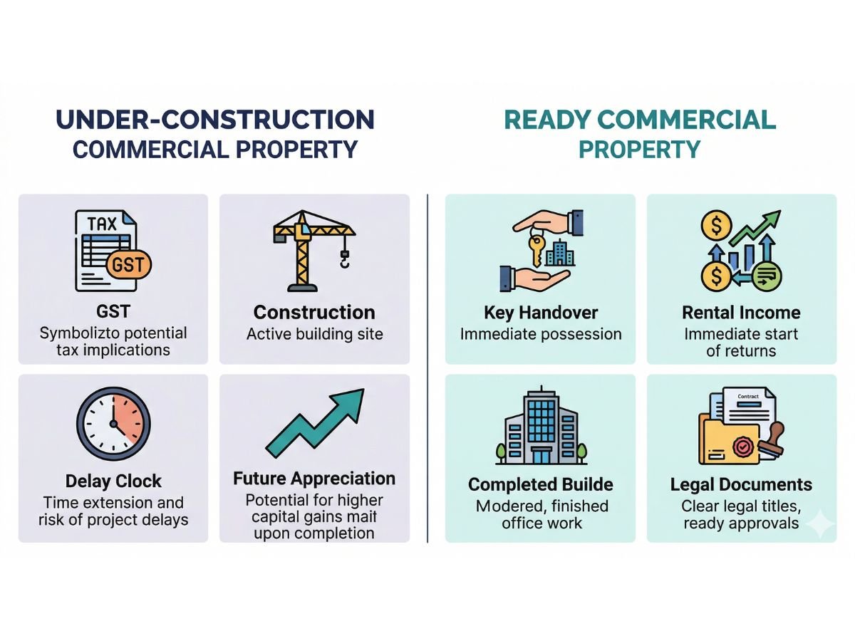 Under-construction commercial property should be treated as a specialised strategy, not the default smart buy. It works only when the location story is believable, the compliance trail is strong, the price gap survives GST and waiting cost, and you have the patience and capital to hold through uncertainty.
